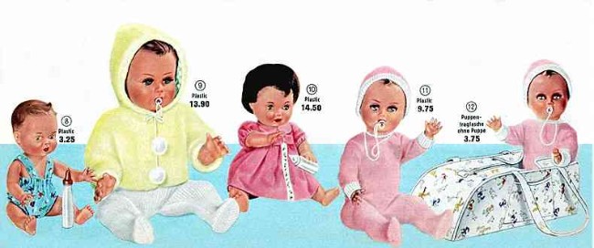 | | 1960 | | Eine gewisse Ähnlichkeit von Puppenmutti und Puppe ist durchaus vorhanden... (um 1960) | | Weihnachtliche Freude über drei Schildkröt-Puppen |  | Versandhaus Quelle: "Der Wunschtraum unserer Mädchen geht in Erfüllung" - "Plastic-Puppen in reizender Kleidung" (1961)