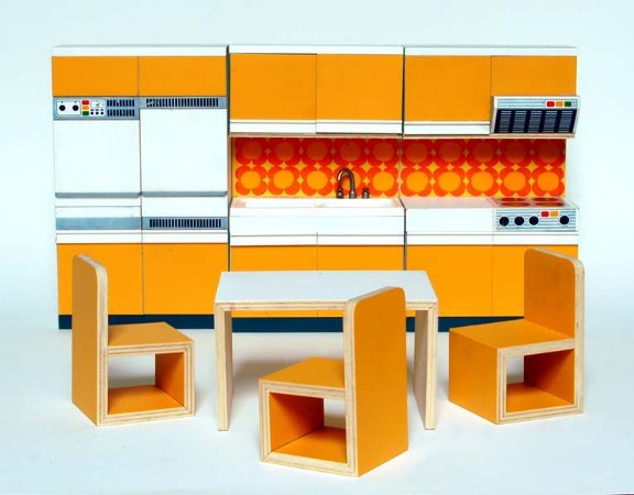 In der Regel gelingt es Hennig, durch schnelles Reagieren mit seinen spielgerechten Modellen nur unwesentlich später auf den Markt zu kommen als die Wohnmöbelfabriken mit ihren jeweiligen Neuheiten. Damit nicht genug, bezieht die Firma ihre Hölzer von denselben Anbietern. Und weil man für solch solide Puppenmöbel auch entsprechend dimensionierte Puppenhäuser benötigt, bietet Hennig diese konsequenterweise ebenfalls an. Zwar hat er 1974 nur drei verschiedene Typen im Sortiment „um den Markt nicht durch zu viele Variationen zu überschütten“, doch die haben es in sich. Besonders imposant kommt ein beidseitig bespielbares, aus quaderförmigen weißen Elementen zusammengesetztes und somit Bauhaus-Architektur zitierendes Exemplar mit den stattlichen Ausmaßen 90 X 60 X 49cm daher, das heute trotz seines vergleichsweise geringen Alters nur mehr ausgesprochen selten zu finden ist. Recht häufig hingegen stößt man noch auf einige aus Kunststoff gefertigte Produkte aus dem seinerzeitigen Hennig-Programm. Dies ist nicht weiter verwunderlich, wurden doch beispielsweise von einem Set seit 1963 angebotener türkisfarbener Badezimmermöbel im Laufe der Jahre rund 300000 Exemplare verkauft. - (Auszug aus meinem Artikel "Puppenhäuser der 70er Jahre" im Sammlermagazin Trödler / Juli 2008)  | Küche, Bodo Hennig, 1972, Schrankhöhe 18cm |