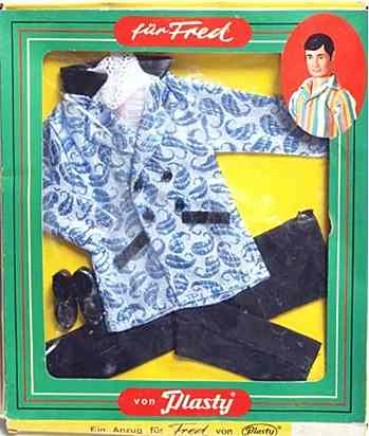 "Fred von Plasty"  | | "Ein Anzug für Fred von Plasty": Todschickes Disko-Outfit im Glitzerlook für Petras Fred |  | | Bislang sammle ich "Petra" nur sporadisch, besitze daher auch erst einen "Fred" (noch dazu einen recht derangierten), der Bestandteil eines jüngst erstandenen Konvoluts war. Schuhe besitzt Fred zwar zur genüge, leider aber hat er noch keine vernünftige Hose. So wie auf dem Foto fand ich ihn im Karton vor: mit Fuß umschließender Skianzugshose zur Smokingjacke. Sieht nicht wirklich cool aus...aber auch nicht ganz unoriginell... |