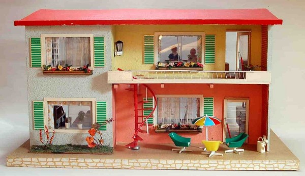 | aus dem Quelle-Katalog Herbst/Winter 1968/69: "Puppenhaus im Bungalow-Stil, stabile Holzverarbeitung. Zwei Zimmer in den Größen ca. 37 x 28cm und ca. 32 x 28cm. Vorderfront mit starken Glasschiebetüren, verschliffen. Gesamtlänge ca. 75cm, Höhe ca. 25cm. Ohne Puppen-Gartenmöbel DM 29,80"