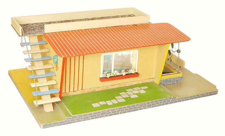 | |  | | "...holzgeformt für Kinderhand - Puppenhaus "Elfi", dem modernen Wohnungsbau angepaßt, mit Dachgarten, Freisitzfläche, aufklappbaren Plastikfenstern, geschmackvoll lackiert. Auch zerlegt lieferbar." | | "Heute Wunsch - morgen Wirklichkeit" - Bausparkassenwerbung (1961) |