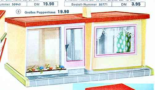 |  | "Großes Puppenhaus, zwei Zimmer, Terasse mit Flügeltüre und Blumenkasten. Herrliche, bunte Lackierung, innen moderngemusterte Tapeten; zusammenlegbar - DM19,90" - aus dem Quelle-Katalog Herbst/Winter 1962/63