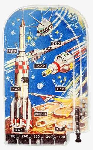 | | Meist war relativ schnell die Abschussvorrichtung der Kugel defekt, weshalb diese sehr weit verbreiteten "Kirmesspielzeuge" heute nurmehr ausgesprochen selten zu entdecken sind. Maße: 11,5 x 18cm, um 1960 |