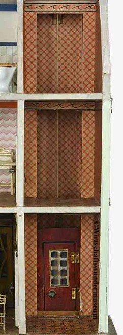 | Kleines Puppenhaus von Moritz Gostschalk (1928, Maße: 37 x 27 x 53 cm), schon mal überstrichen – trotzdem schön! Das Tollste: Der Aufzug!